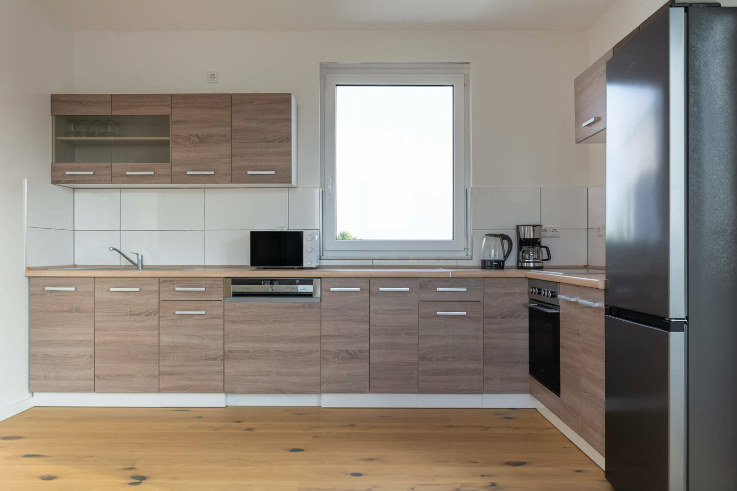 Kuchnia: lodówko-zamrażarka, zmywarka, piekarnik, kuchenka mikrofalowa, ekspres do kawy, czajnik, garnki, patelnie, zestaw noży, naczynia, szklanki, kubki, sztućce, różne przybory kuchenne, papier do pieczenia, przyprawy, kawa, filtr do kawy, olej, cukier i słodzik
