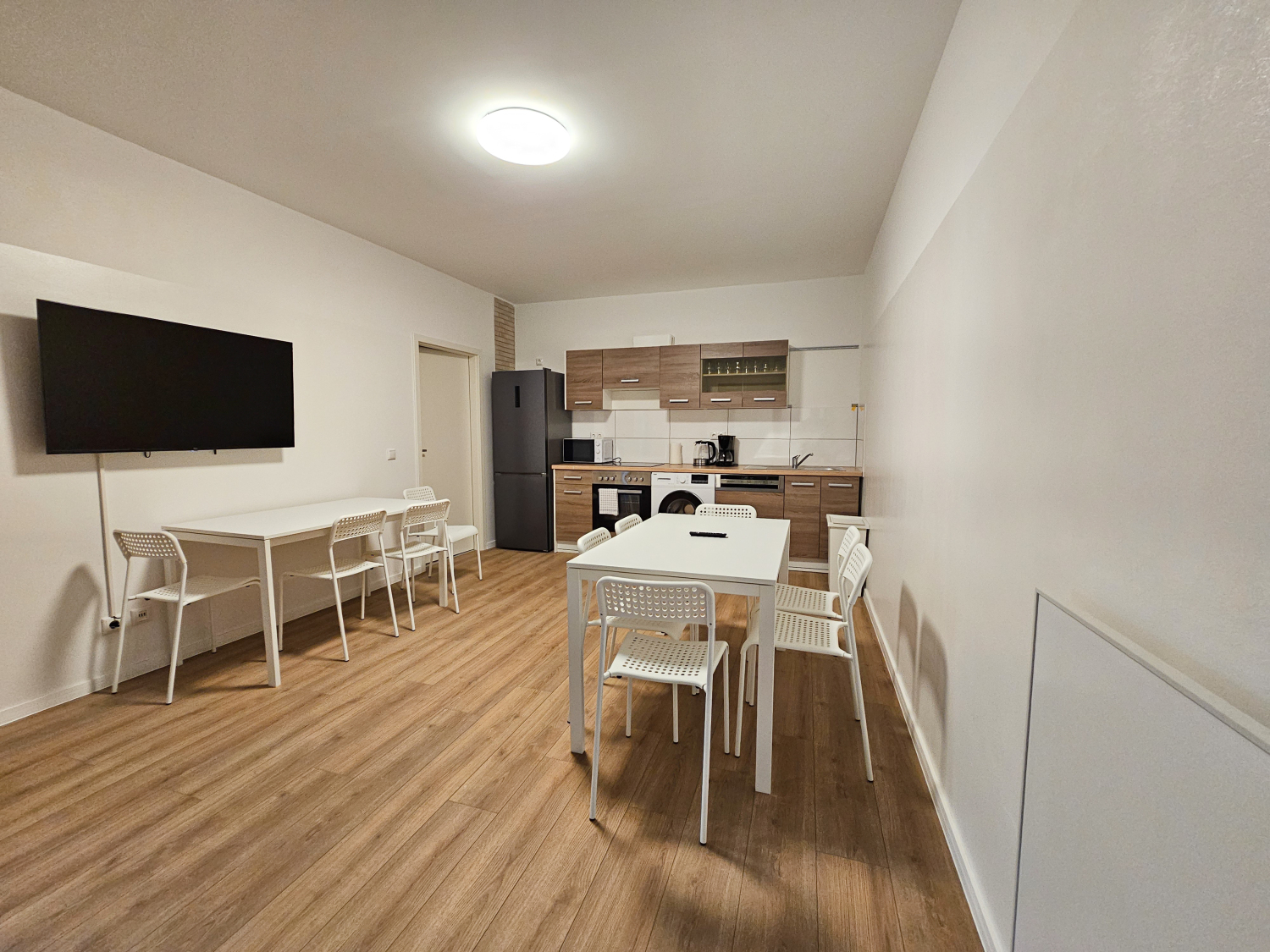 Küche: Kühl-Gefrierkombinationen , Spülmaschine , Backofen , Mikrowelle , Kaffeemaschine , Wasserkocher , Töpfe , Pfannen , Messerset , Geschirr , Gläser , Tassen , Besteck , diverse Kochutensilien , Backpapier , Gewürze , Kaffee , Kaffeefilter , Öl , Zucker und Süßstoff