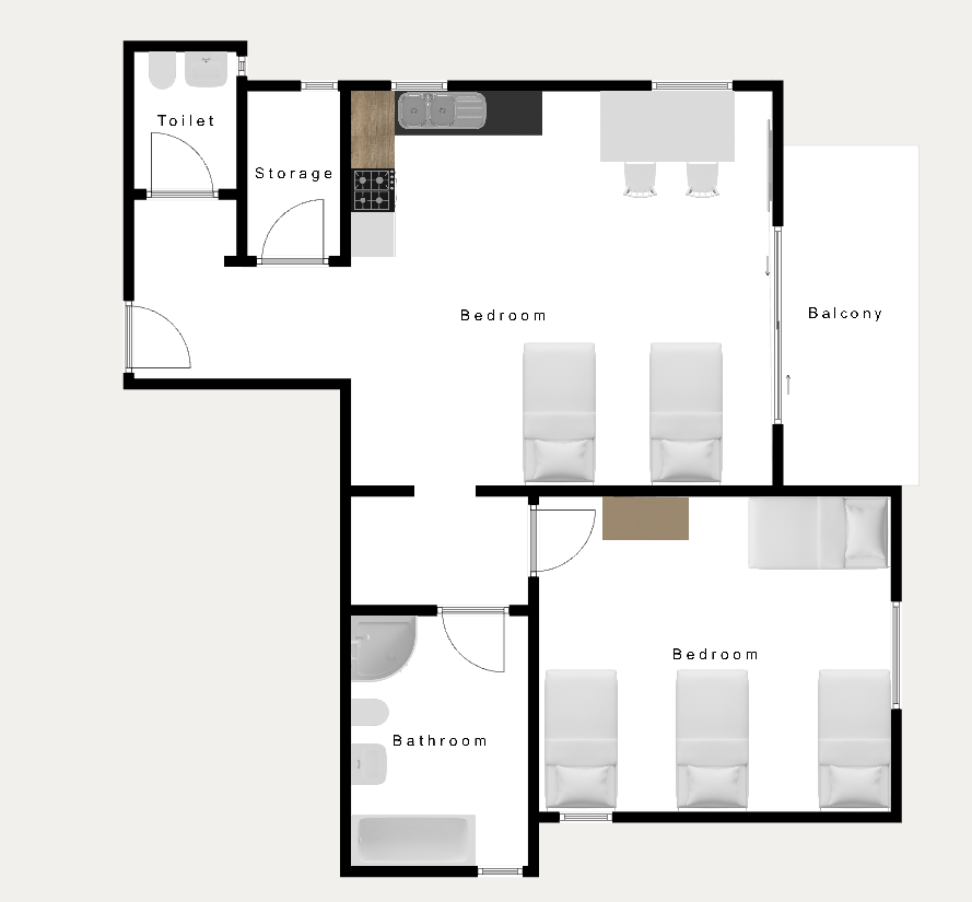Kuchyňa: chladnička s mrazničkou , umývačka riadu , rúra na pečenie , mikrovlnná rúra , kávovar , rýchlovarná kanvica , hrnce , panvice , sada nožov , riad , poháre , šálky , príbory , rôzne kuchynské potreby , papier na pečenie , korenie , kávový filter , olej , cukor a sladidlo